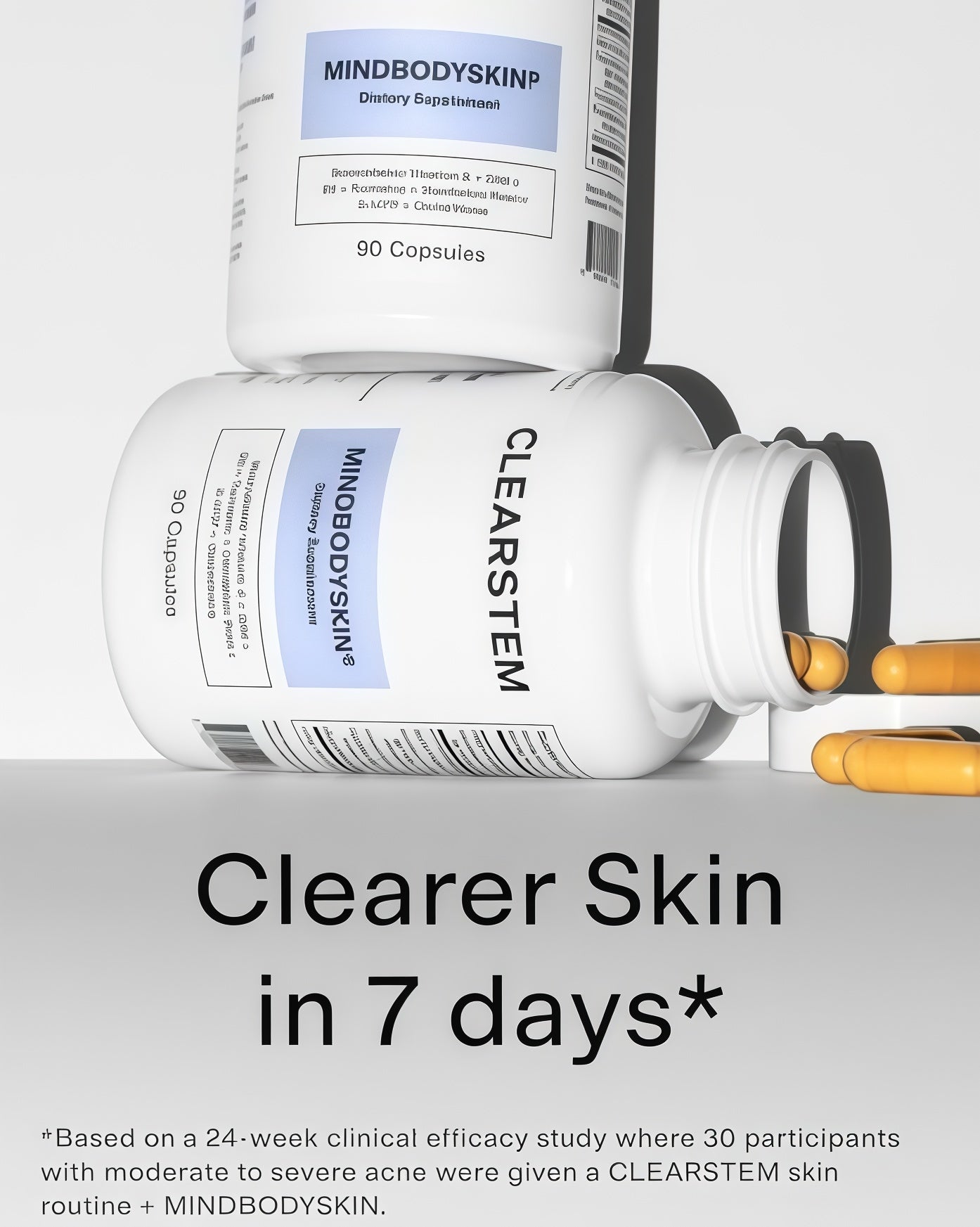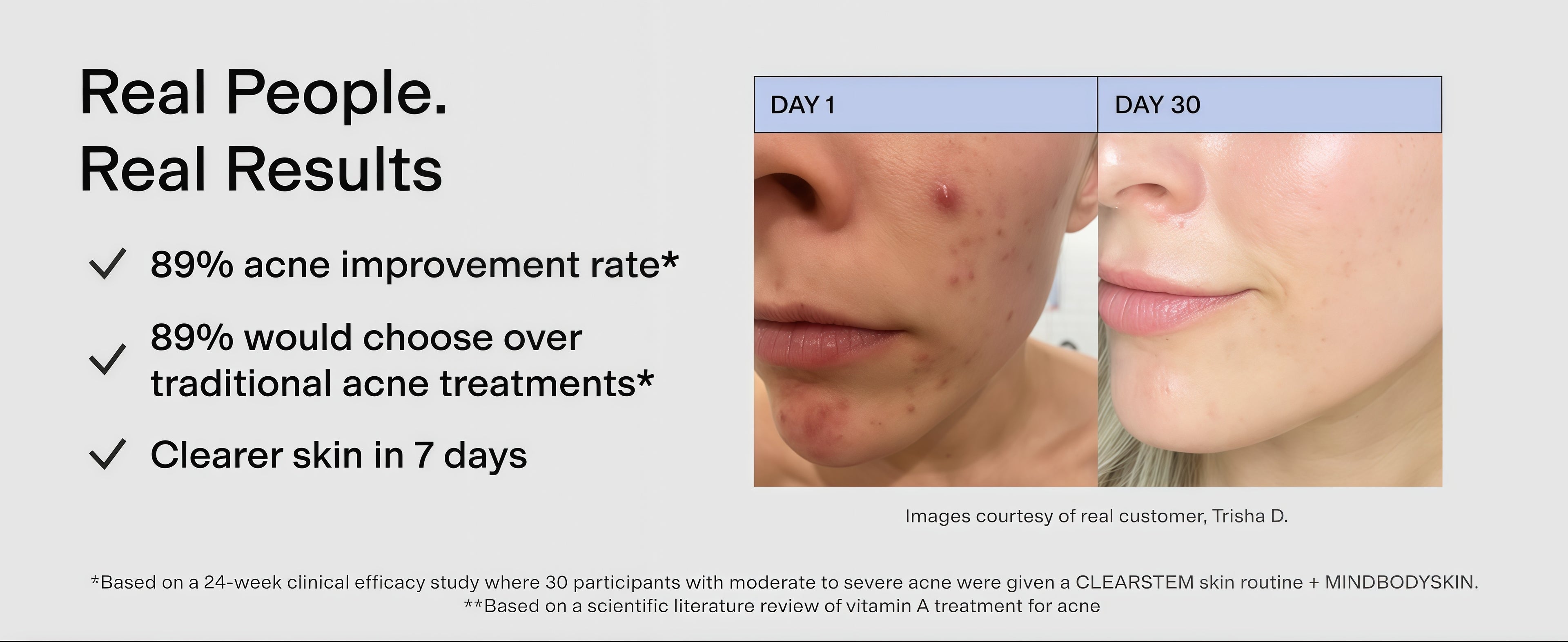 Based on a 24-week clinical efficacy study where 30 participants with moderate to severe acne were given a CLEARSTEM skin routine + MINDBODYSKIN.