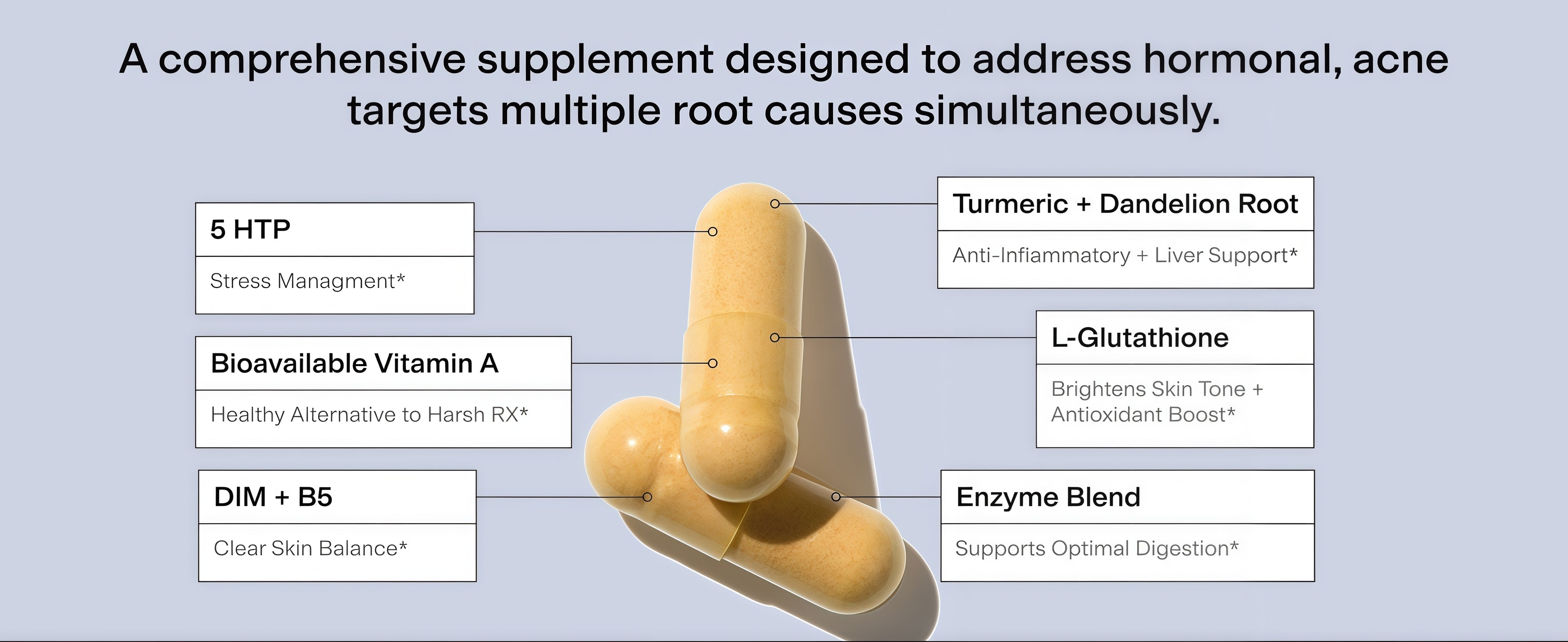The main ingredients in this hormonal acne supplement are Vitamin A, Vitamin B5, 5-HTP, DlM, a proprietary liver blendincluding Milk Thistle and Dandelion Extract, L-Glutathione, Turmeric, and a proprietary digestive blend including Proteaseand Betaine Hydrochloride.