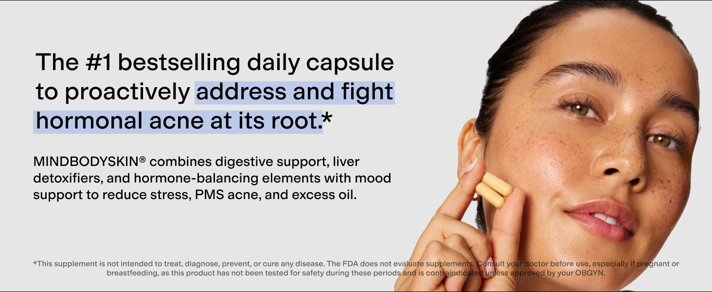 MINDBODYSKIN® is a holistic hormonal acne supplement that supports skin clarity by balancing hormones, improving gut health, and aiding detoxification — clear, calm skin from the inside out.